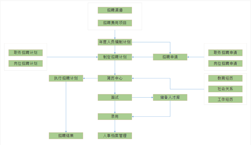 下面介紹一下同鑫招聘選撥模塊的功能情況:招聘渠道、招聘費用、年度編制計劃、任職職務(wù)資格、崗位的招聘計劃、招聘的申請、簡歷的收取、面試選撥、錄用、淘汰管理、人事檔案管理。