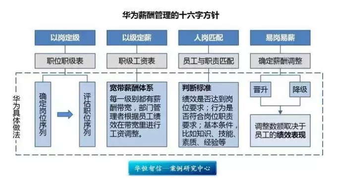 總體來講,可以用16個(gè)字來概括華為的薪酬管理:以崗定級(jí)、以級(jí)定薪、人崗匹配、易崗易薪。